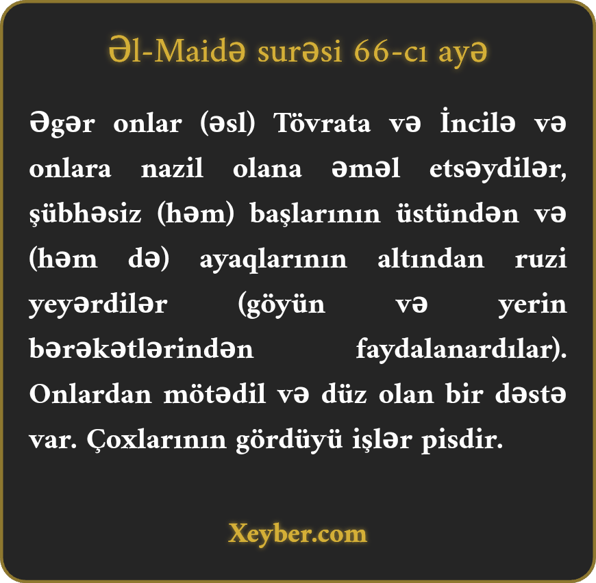 "Əgər onlar (yəhudilər və məsihilər) Tövrat və İncili, Rəbləri tərəfindən onlara nazil olanı bərpa etsəydilər, başlarının üstündən (səmadan) və ayaqlarının altından (yerdən) ruzi yeyərdilər. Onlardan bəziləri orta haldadırlar. Amma çoxlarının gördüyü iş pisdir.”