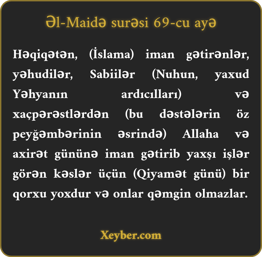 "Həqiqətən iman gətirənlər, möminlər, yəhudilər, sabiilər, məsihilər, qiyamət gününə iman gətirib saleh iş görənlərin heç biri üçün qəm yoxdur.”