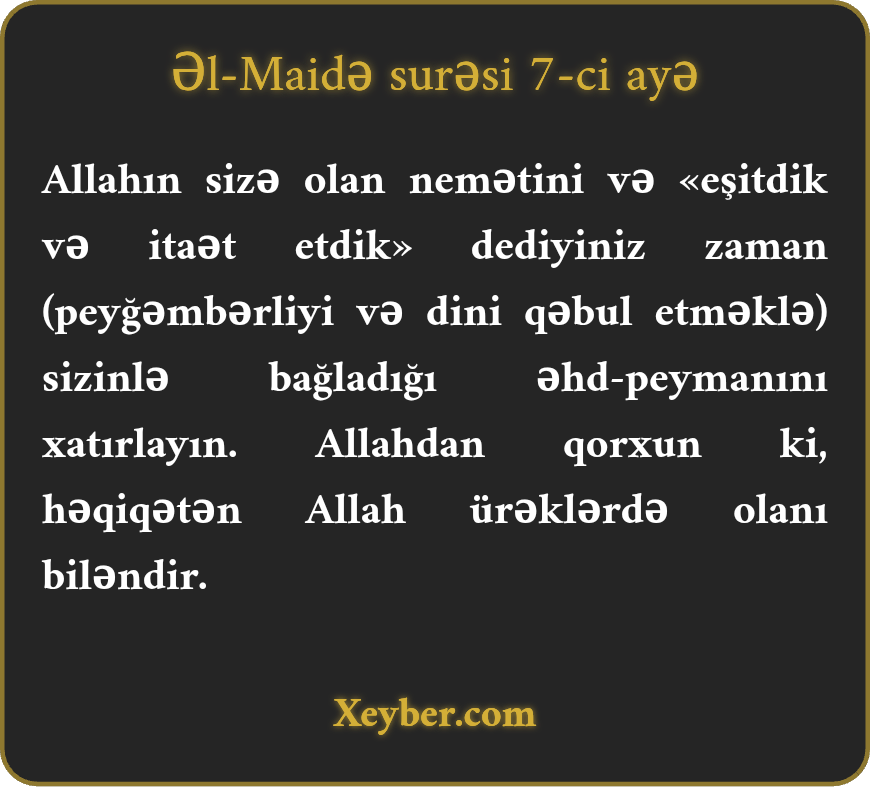 "Xatırlayın Allahın sizə əta etdiyi neməti və "eşitdik və itaət etdik” dediyiniz zaman sizinlə bağladığı əhdi! Allahdan çəkinin! Çünki Allah sinələrdə olandan agahdır.”