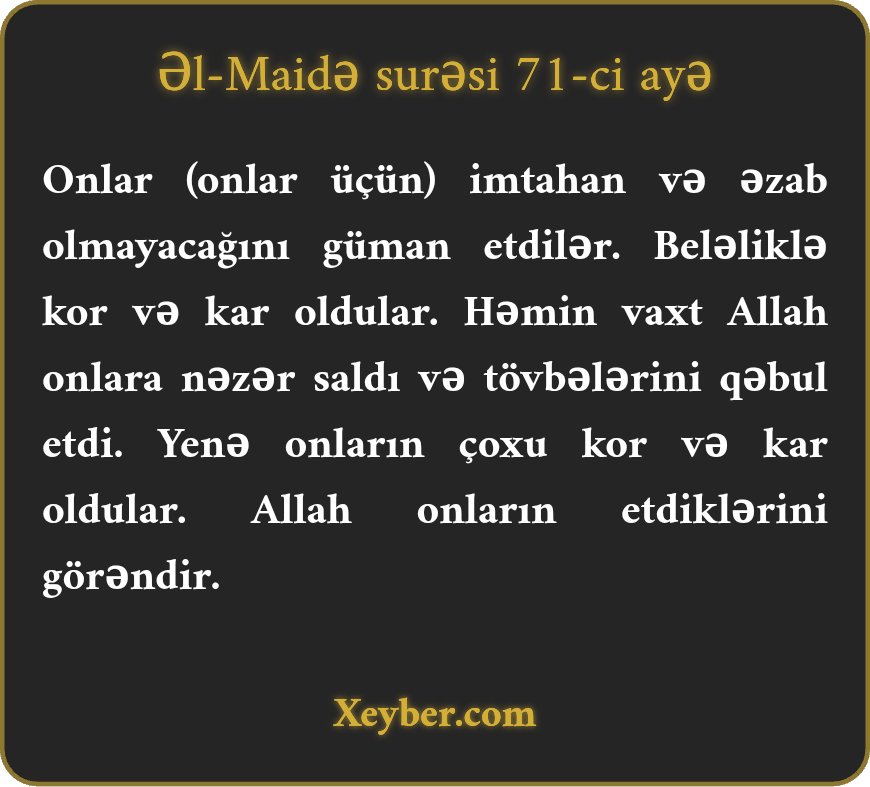"(Yəhudilər özlərini xalqdan və Allahın övliyalarından üstün tutduqları üçün ) cəza və sınağa düçar olmayacaqlarını güman etdilər. (Həqiqətləri gördükdən sonra) kor və kar oldular. Sonra Allah (onlara lütf göstərərək) tövbələrini qəbul etdi. Növbəti dəfə onlardan çoxu (ilahi ayələri görməkdə və ya eşitməkdə) kor və kar oldular. Allah onların etdiklərini görəndir.”