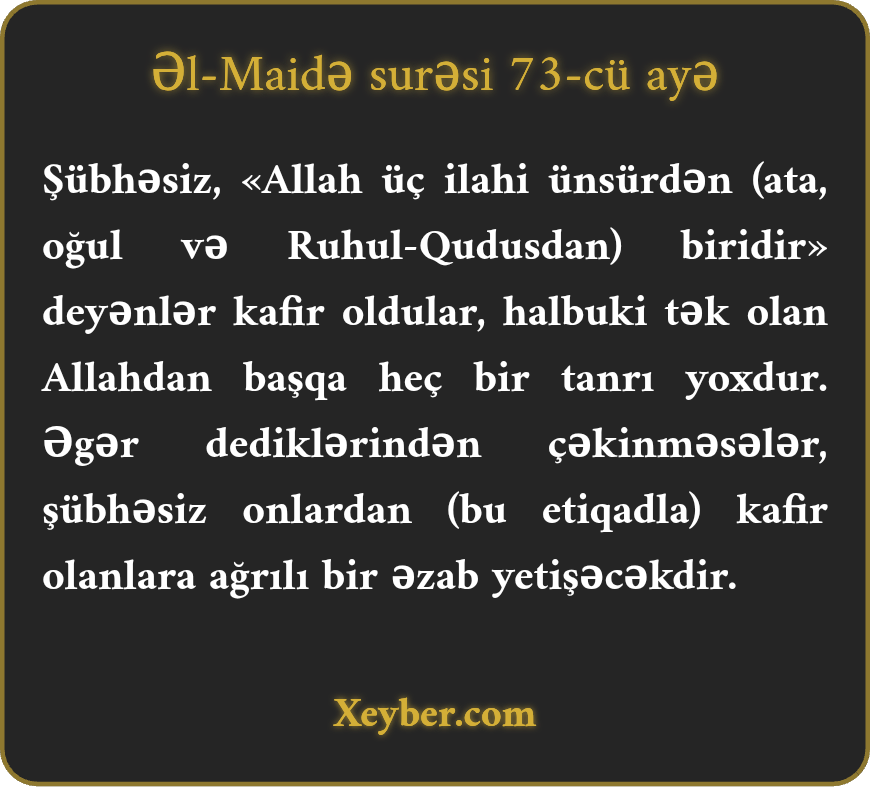 "Həqiqətən, Allah üçdən biridir” deyənlər kafir oldular. Bir Allahdan savay Allah yoxdur. Əgər dediklərindən əl götürməsələr, kitab əhlinin kafirlərinə, şübhəsiz, dərdli əzab yetişəcək.”