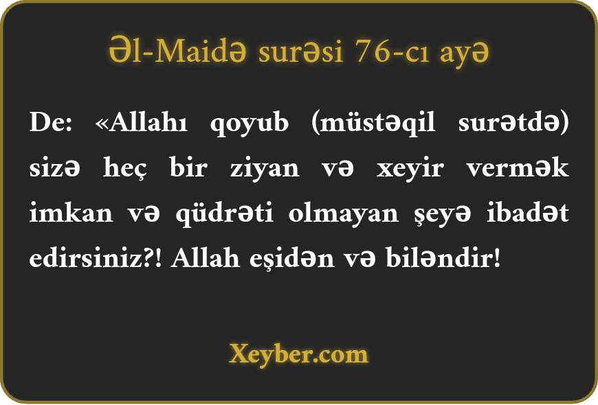 "(Ey peyğəmbər! Xalqa) de ki, sizin üçün heç bir faydası və zərəri olmayan, Allahdan qeyrisinəmi pərəstiş edirsiniz? Halbuki Allah eşidən və biləndir.”