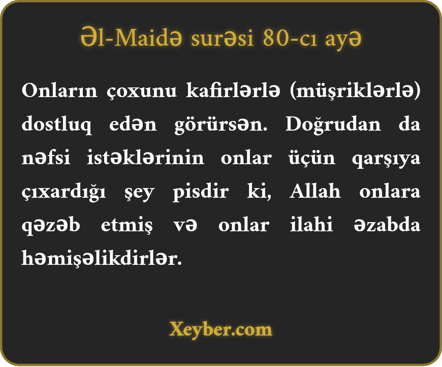 "Onların (Bəni-İsrailin) bir çoxunun kafirlərlə dostluq etdiyini görürsən. (Onları özlərinə rəhbər götürürlər.) Öncədən necə də pis əməllər göndərirlər? (Nəticədə) Allah onlara qəzəb etdi və onlar əzabda əbədi qalacaqlar.”