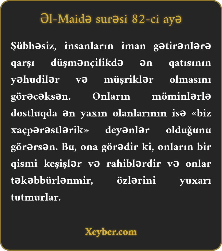 «Yəhudilərin və müşriklərin iman əhlinə münasibətdə ən qatı düşmən olduğunu görərsən. "Biz məsihiyik” deyənlərin isə dostluq baxımından möminlərə ən yaxın olduğunu bilərsən. Bu (dostluq) o baxımdandır ki, onlardan bəziləri keşiş və rahiblərdir, onlar təkəbbür göstərməzlər.»