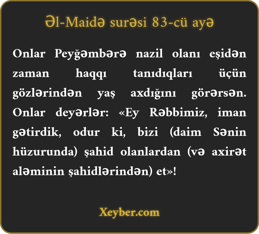 "(Məsihilər) hər vaxt peyğəmbərə nazil olmuş ayəni eşitdikdə, görürsən ki, haqqı tanıdıqlarından gözləri yaşla dolur və deyirlər: "Pərvərdigara! Biz iman gətirdik, adımızı (haqqa) şahidlər zümrəsində yaz.”