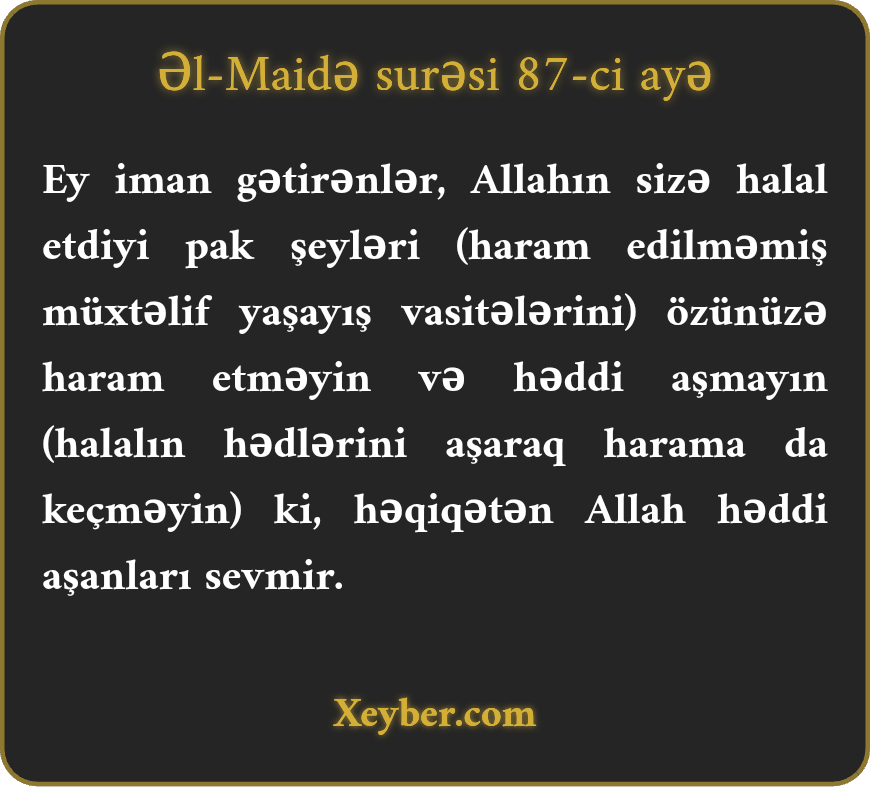 "Ey iman gətirənlər! Allahın sizə halal etdiyi pak şeyləri özünüzə haram etməyin və həddi aşmayın ki, Allah təcavüzkarları sevməz.”