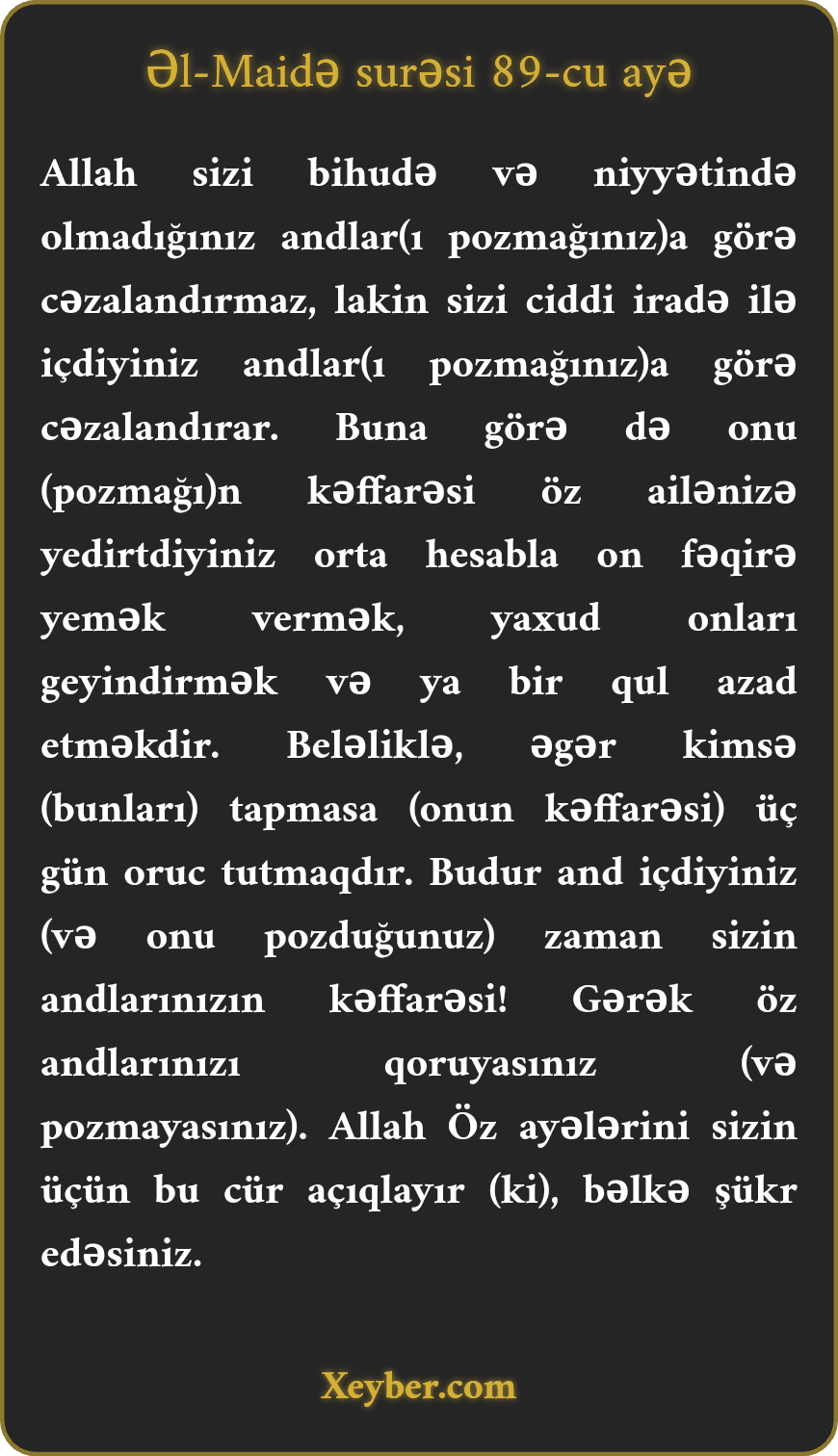 "Allah sizi boş, hədər andlarınıza görə sorğuya çəkməz. Amma bilərəkdən içdiyiniz andlara görə cəzalandırar. Onun (andı pozmağın) kəffarəsi ailənizə yedirdiyinizdən orta həddə on fəqirə təam vermək, ya on fəqiri geyindirmək, ya da qul azad etməkdir. Əgər bir kəs (qida, geyim və qul) tapmasa, üç gün oruc tutsun. Bu, sizin andlarınızın kəffarəsidir. Nə vaxt and içdinizsə, andlarınıza diqqət yetirin. Allah Öz ayələrini sizin üçün belə bəyan edir ki, bəlkə şükür edəsiniz.”