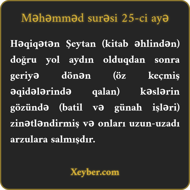 Həqiqətən Şeytan (kitab əhlindən) doğru yol aydın olduqdan sonra geriyə dönən (öz keçmiş əqidələrində qalan) kəslərin gözündə (batil və günah işləri) zinətləndirmiş və onları uzun-uzadı arzulara salmışdır.