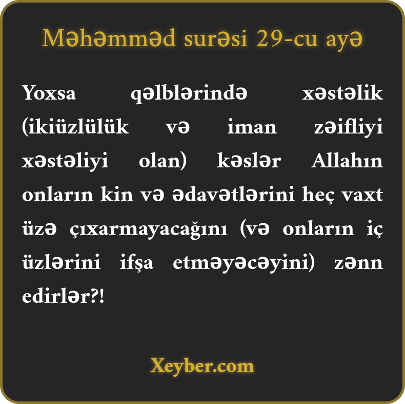 Yoxsa qəlblərində xəstəlik (ikiüzlülük və iman zəifliyi xəstəliyi olan) kəslər Allahın onların kin və ədavətlərini heç vaxt üzə çıxarmayacağını (və onların iç üzlərini ifşa etməyəcəyini) zənn edirlər?!