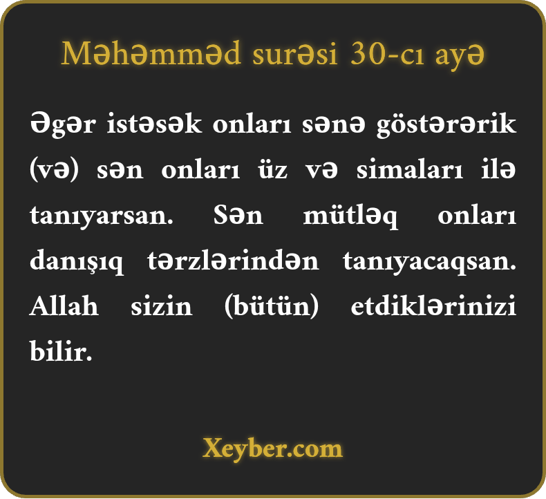 Əgər istəsək onları sənə göstərərik (və) sən onları üz və simaları ilə tanıyarsan. Sən mütləq onları danışıq tərzlərindən tanıyacaqsan. Allah sizin (bütün) etdiklərinizi bilir.