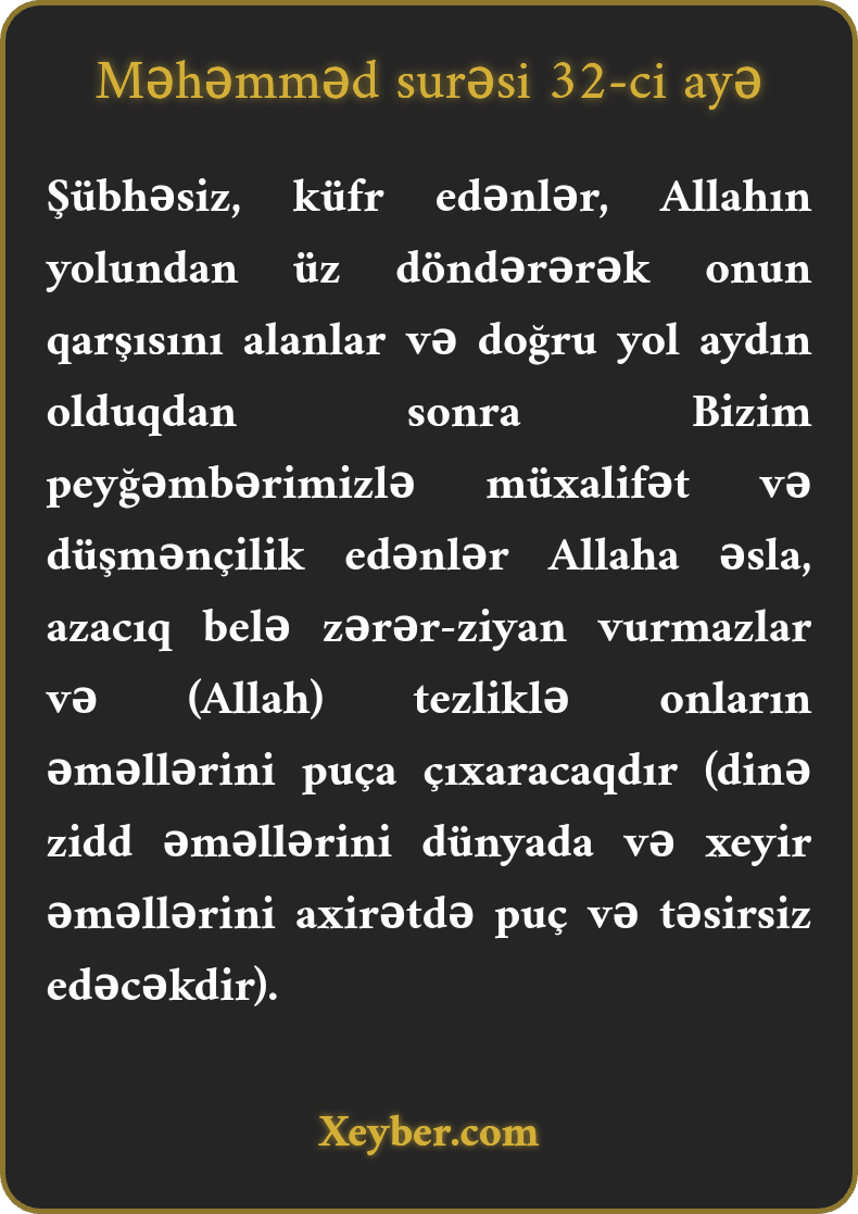 Şübhəsiz, küfr edənlər, Allahın yolundan üz döndərərək onun qarşısını alanlar və doğru yol aydın olduqdan sonra Bizim peyğəmbərimizlə müxalifət və düşmənçilik edənlər Allaha əsla, azacıq belə zərər-ziyan vurmazlar və (Allah) tezliklə onların əməllərini puça çıxaracaqdır (dinə zidd əməllərini dünyada və xeyir əməllərini axirətdə puç və təsirsiz edəcəkdir).