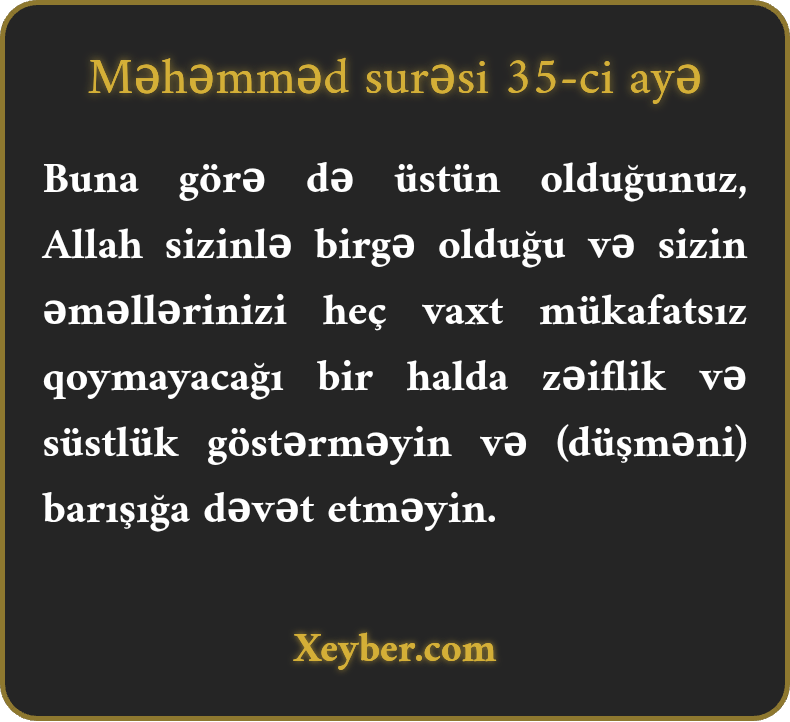 Buna görə də üstün olduğunuz, Allah sizinlə birgə olduğu və sizin əməllərinizi heç vaxt mükafatsız qoymayacağı bir halda zəiflik və süstlük göstərməyin və (düşməni) barışığa dəvət etməyin.