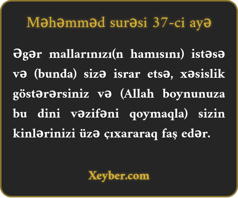 Əgər mallarınızı(n hamısını) istəsə və (bunda) sizə israr etsə, xəsislik göstərərsiniz və (Allah boynunuza bu dini vəzifəni qoymaqla) sizin kinlərinizi üzə çıxararaq faş edər.