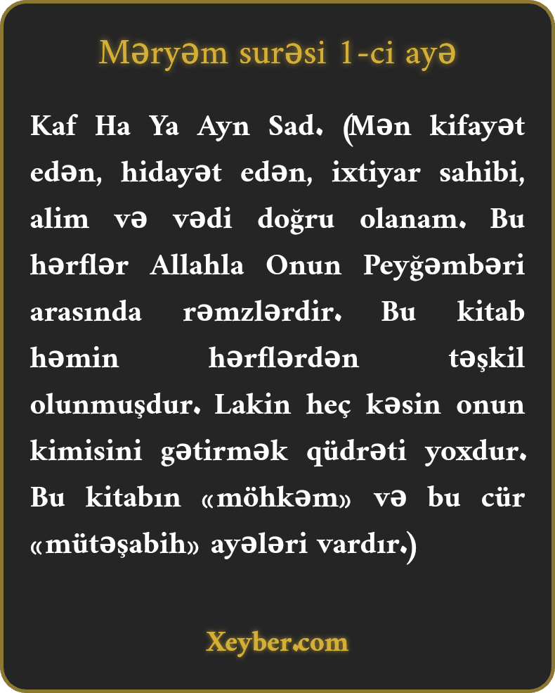 Kaf Ha Ya Ayn Sad. (Mən kifayət edən, hidayət edən, ixtiyar sahibi, alim və vədi doğru olanam. Bu hərflər Allahla Onun Peyğəmbəri arasında rəmzlərdir. Bu kitab həmin hərflərdən təşkil olunmuşdur. Lakin heç kəsin onun kimisini gətirmək qüdrəti yoxdur. Bu kitabın «möhkəm» və bu cür «mütəşabih» ayələri vardır.)