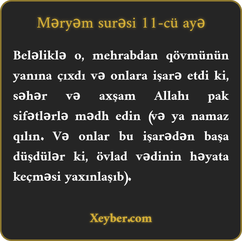 Beləliklə o, mehrabdan qövmünün yanına çıxdı və onlara işarə etdi ki, səhər və axşam Allahı pak sifətlərlə mədh edin (və ya namaz qılın. Və onlar bu işarədən başa düşdülər ki, övlad vədinin həyata keçməsi yaxınlaşıb).