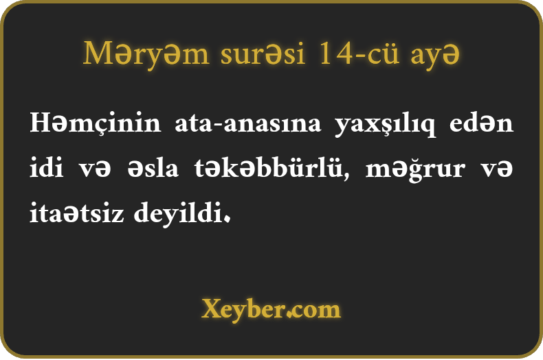 Həmçinin ata-anasına yaxşılıq edən idi və əsla təkəbbürlü, məğrur və itaətsiz deyildi.