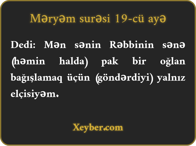 Dedi: Mən sənin Rəbbinin sənə (həmin halda) pak bir oğlan bağışlamaq üçün (göndərdiyi) yalnız elçisiyəm.