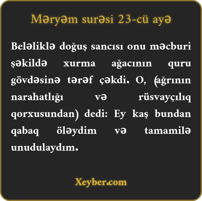 Beləliklə doğuş sancısı onu məcburi şəkildə xurma ağacının quru gövdəsinə tərəf çəkdi. O, (ağrının narahatlığı və rüsvayçılıq qorxusundan) dedi: Ey kaş bundan qabaq öləydim və tamamilə unudulaydım.