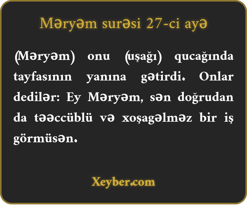 (Məryəm) onu (uşağı) qucağında tayfasının yanına gətirdi. Onlar dedilər: Ey Məryəm, sən doğrudan da təəccüblü və xoşagəlməz bir iş görmüsən.