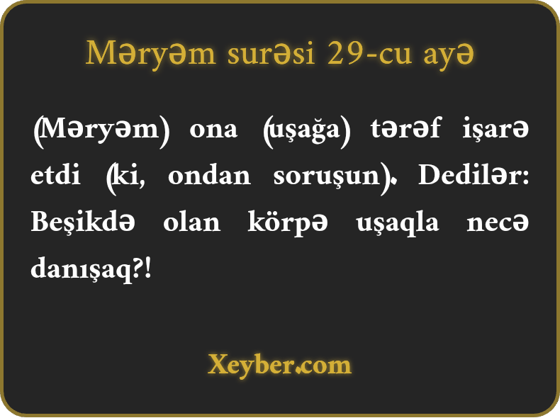 (Məryəm) ona (uşağa) tərəf işarə etdi (ki, ondan soruşun). Dedilər: Beşikdə olan körpə uşaqla necə danışaq?!