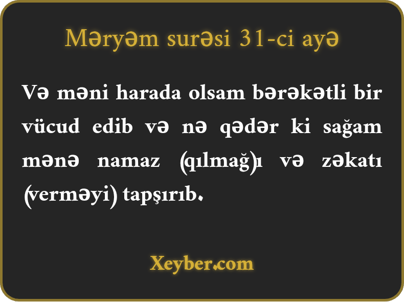 Və məni harada olsam bərəkətli bir vücud edib və nə qədər ki sağam mənə namaz (qılmağ)ı və zəkatı (verməyi) tapşırıb.