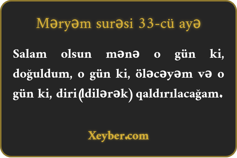 Salam olsun mənə o gün ki, doğuldum, o gün ki, öləcəyəm və o gün ki, diri(ldilərək) qaldırılacağam.