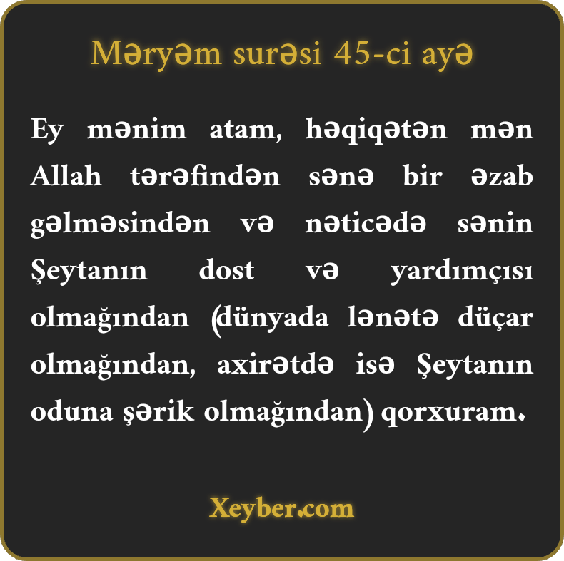 Ey mənim atam, həqiqətən mən Allah tərəfindən sənə bir əzab gəlməsindən və nəticədə sənin Şeytanın dost və yardımçısı olmağından (dünyada lənətə düçar olmağından, axirətdə isə Şeytanın oduna şərik olmağından) qorxuram.