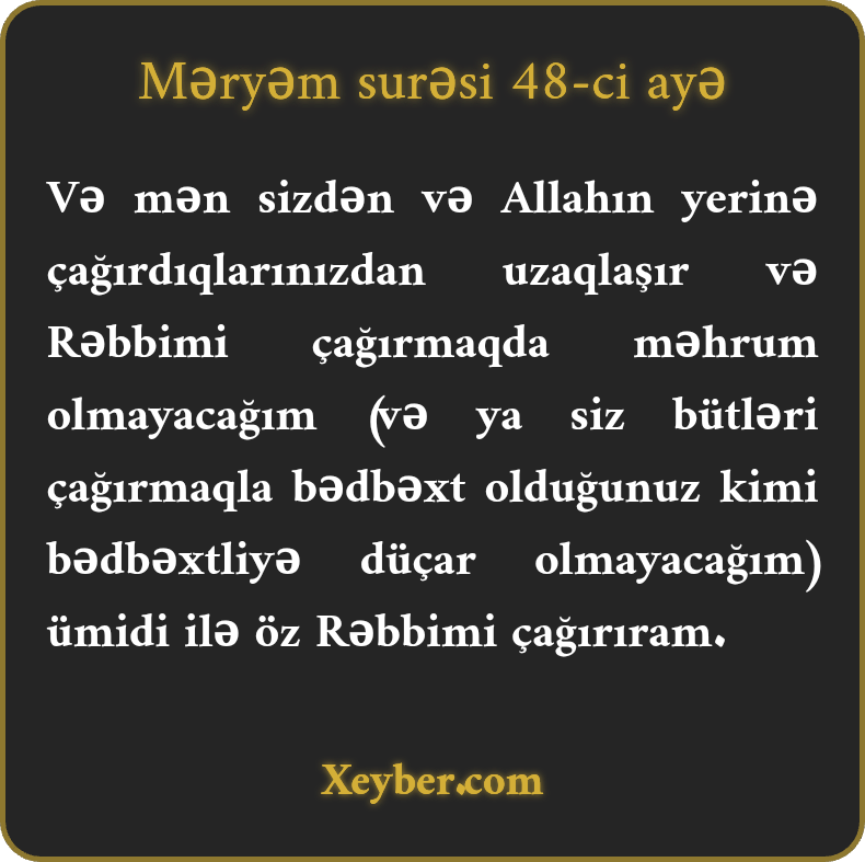 Və mən sizdən və Allahın yerinə çağırdıqlarınızdan uzaqlaşır və Rəbbimi çağırmaqda məhrum olmayacağım (və ya siz bütləri çağırmaqla bədbəxt olduğunuz kimi bədbəxtliyə düçar olmayacağım) ümidi ilə öz Rəbbimi çağırıram.