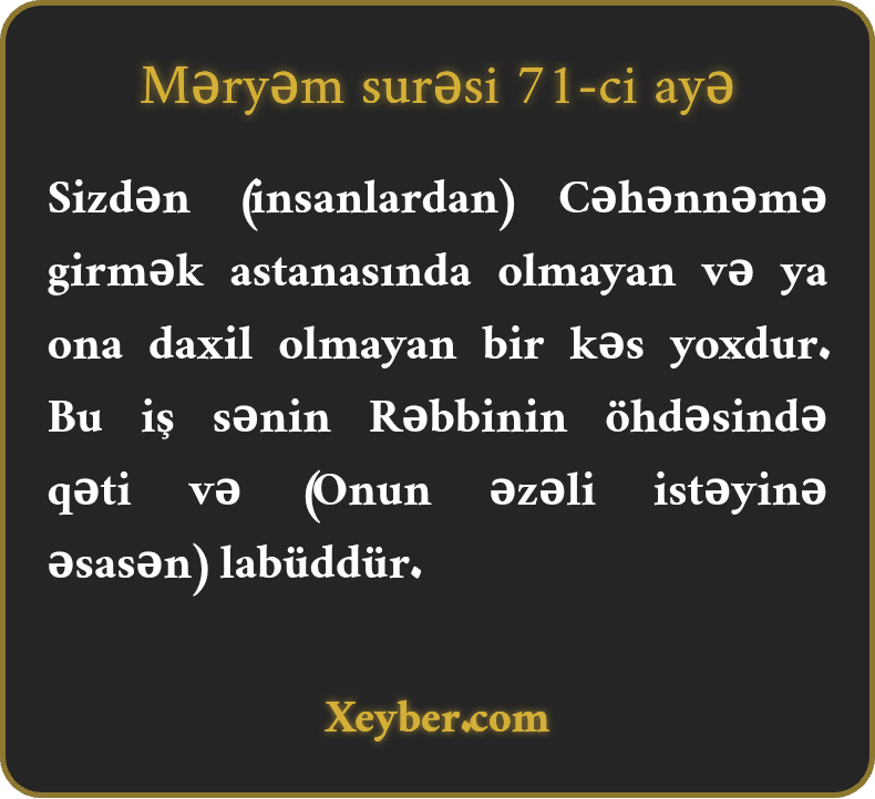 Sizdən (insanlardan) Cəhənnəmə girmək astanasında olmayan və ya ona daxil olmayan bir kəs yoxdur. Bu iş sənin Rəbbinin öhdəsində qəti və (Onun əzəli istəyinə əsasən) labüddür.