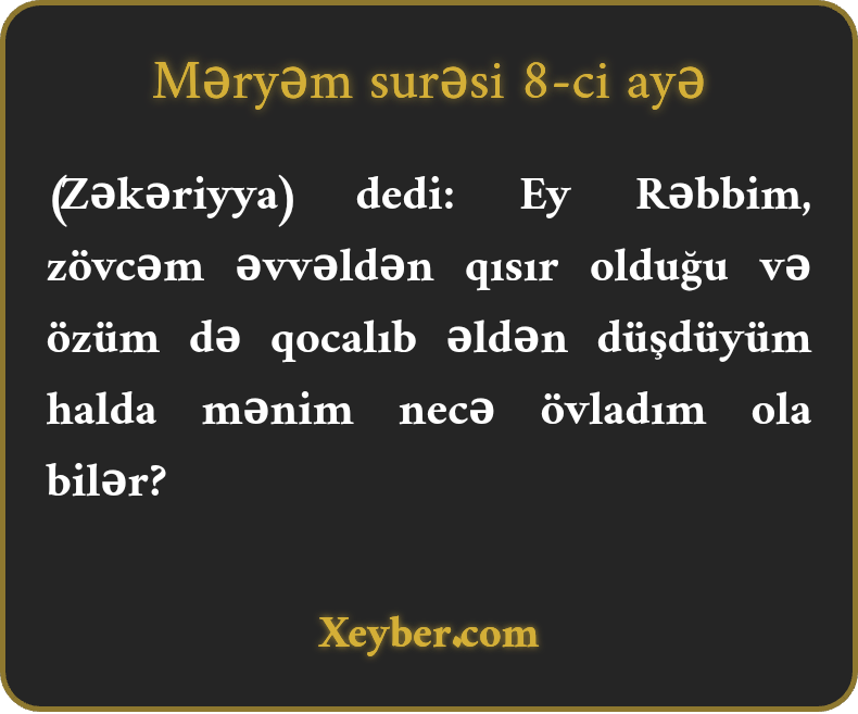 (Zəkəriyya) dedi: Ey Rəbbim, zövcəm əvvəldən qısır olduğu və özüm də qocalıb əldən düşdüyüm halda mənim necə övladım ola bilər?