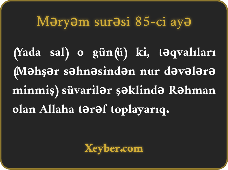 (Yada sal) o gün(ü) ki, təqvalıları (Məhşər səhnəsindən nur dəvələrə minmiş) süvarilər şəklində Rəhman olan Allaha tərəf toplayarıq.