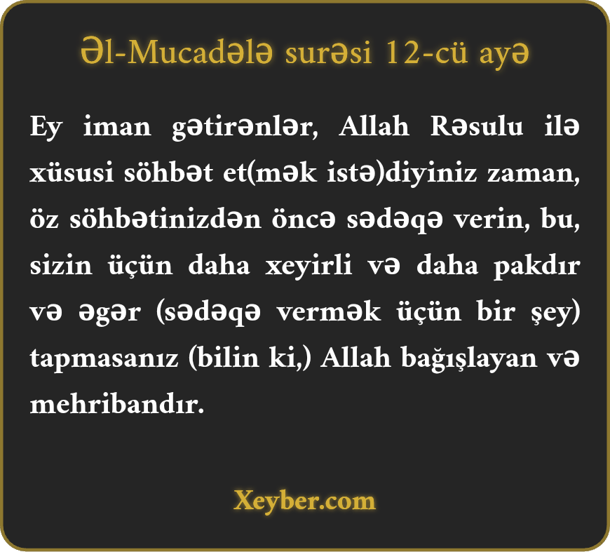 Ey iman gətirənlər, Allah Rəsulu ilə xüsusi söhbət et(mək istə)diyiniz zaman, öz söhbətinizdən öncə sədəqə verin, bu, sizin üçün daha xeyirli və daha pakdır və əgər (sədəqə vermək üçün bir şey) tapmasanız (bilin ki,) Allah bağışlayan və mehribandır.