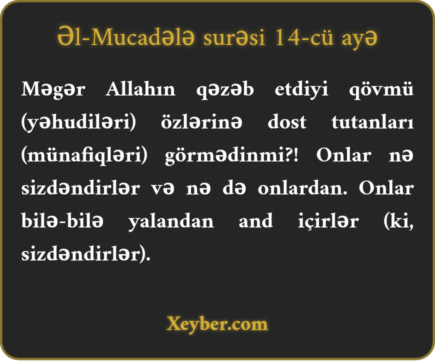 Məgər Allahın qəzəb etdiyi qövmü (yəhudiləri) özlərinə dost tutanları (münafiqləri) görmədinmi?! Onlar nə sizdəndirlər və nə də onlardan. Onlar bilə-bilə yalandan and içirlər (ki, sizdəndirlər).