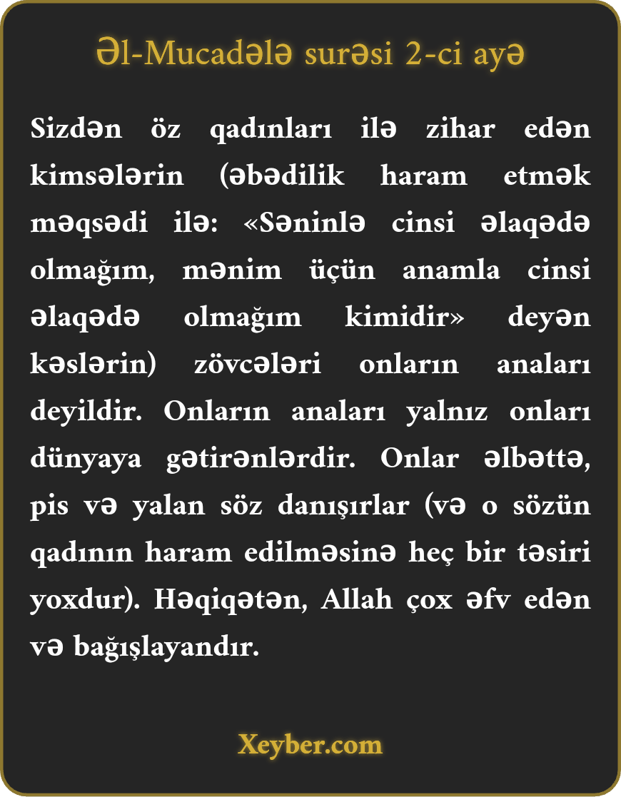 Sizdən öz qadınları ilə zihar edən kimsələrin (əbədilik haram etmək məqsədi ilə: «Səninlə cinsi əlaqədə olmağım, mənim üçün anamla cinsi əlaqədə olmağım kimidir» deyən kəslərin) zövcələri onların anaları deyildir. Onların anaları yalnız onları dünyaya gətirənlərdir. Onlar əlbəttə, pis və yalan söz danışırlar (və o sözün qadının haram edilməsinə heç bir təsiri yoxdur). Həqiqətən, Allah çox əfv edən və bağışlayandır.