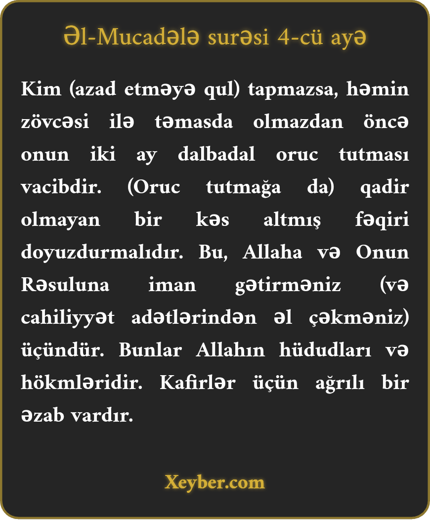 Kim (azad etməyə qul) tapmazsa, həmin zövcəsi ilə təmasda olmazdan öncə onun iki ay dalbadal oruc tutması vacibdir. (Oruc tutmağa da) qadir olmayan bir kəs altmış fəqiri doyuzdurmalıdır. Bu, Allaha və Onun Rəsuluna iman gətirməniz (və cahiliyyət adətlərindən əl çəkməniz) üçündür. Bunlar Allahın hüdudları və hökmləridir. Kafirlər üçün ağrılı bir əzab vardır.
