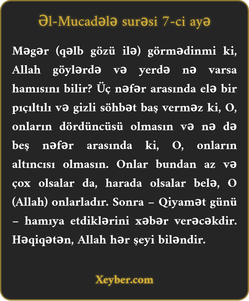 Məgər (qəlb gözü ilə) görmədinmi ki, Allah göylərdə və yerdə nə varsa hamısını bilir? Üç nəfər arasında elə bir pıçıltılı və gizli söhbət baş verməz ki, O, onların dördüncüsü olmasın və nə də beş nəfər arasında ki, O, onların altıncısı olmasın. Onlar bundan az və çox olsalar da, harada olsalar belə, O (Allah) onlarladır. Sonra – Qiyamət günü – hamıya etdiklərini xəbər verəcəkdir. Həqiqətən, Allah hər şeyi biləndir.