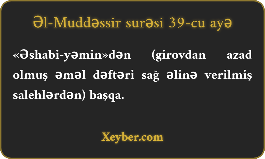 «Əshabi-yəmin»dən (girovdan azad olmuş əməl dəftəri sağ əlinə verilmiş salehlərdən) başqa.
