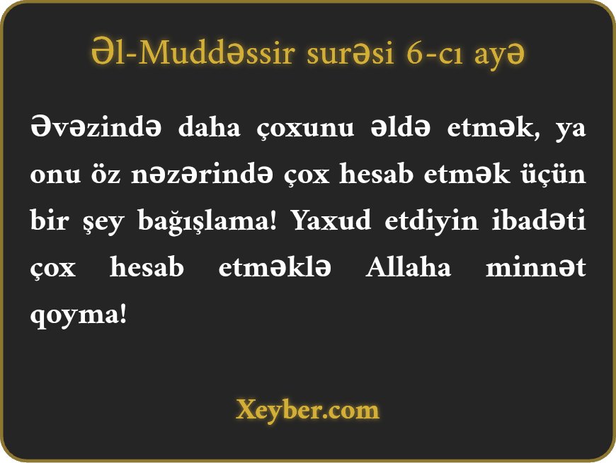Əvəzində daha çoxunu əldə etmək, ya onu öz nəzərində çox hesab etmək üçün bir şey bağışlama! Yaxud etdiyin ibadəti çox hesab etməklə Allaha minnət qoyma!