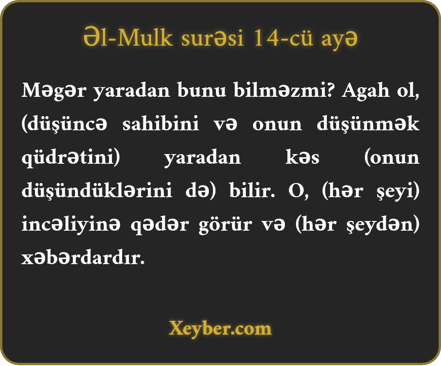 Məgər yaradan bunu bilməzmi? Agah ol, (düşüncə sahibini və onun düşünmək qüdrətini) yaradan kəs (onun düşündüklərini də) bilir. O, (hər şeyi) incəliyinə qədər görür və (hər şeydən) xəbərdardır.