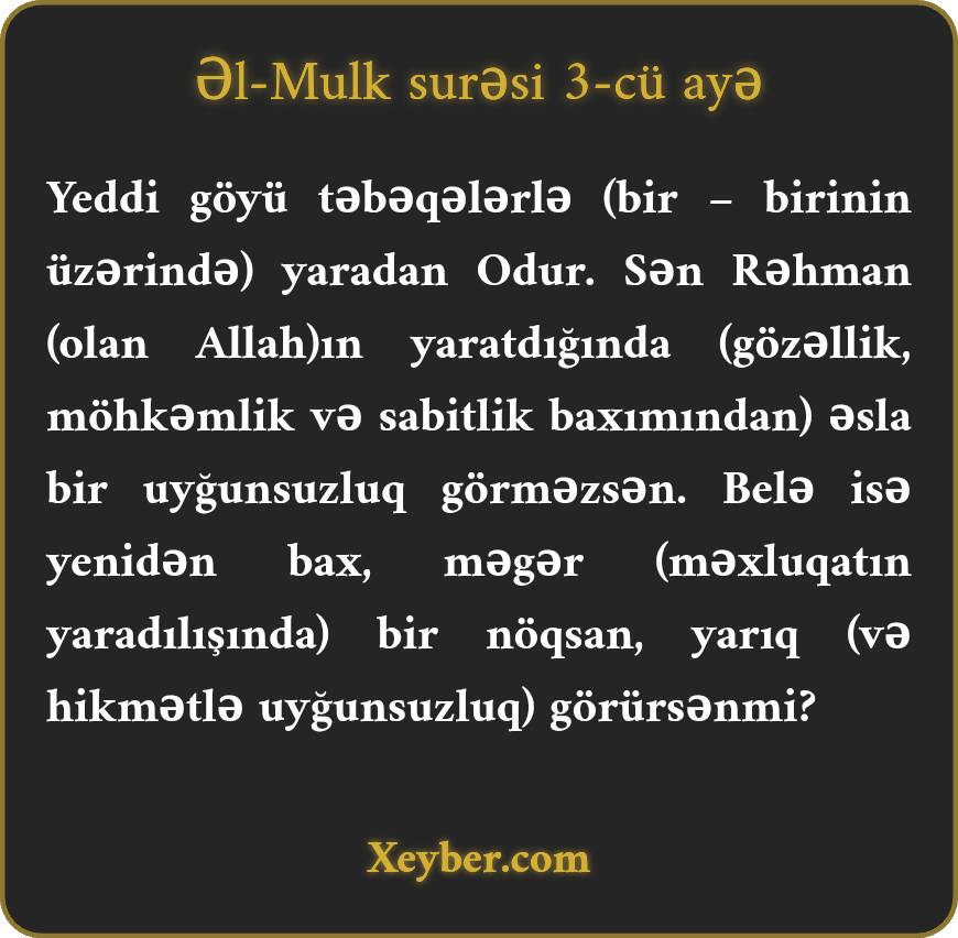 Yeddi göyü təbəqələrlə (bir – birinin üzərində) yaradan Odur. Sən Rəhman (olan Allah)ın yaratdığında (gözəllik, möhkəmlik və sabitlik baxımından) əsla bir uyğunsuzluq görməzsən. Belə isə yenidən bax, məgər (məxluqatın yaradılışında) bir nöqsan, yarıq (və hikmətlə uyğunsuzluq) görürsənmi?