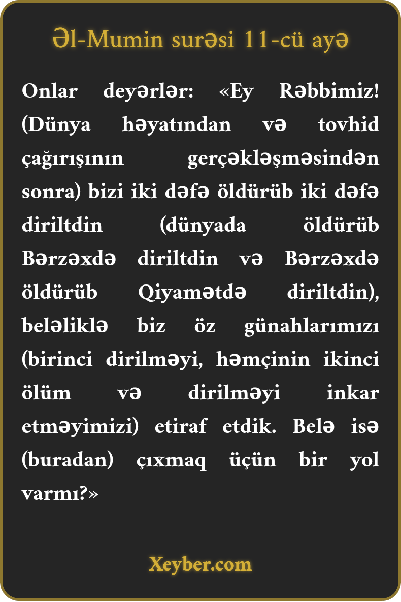Onlar deyərlər: «Ey Rəbbimiz! (Dünya həyatından və tovhid çağırışının gerçəkləşməsindən sonra) bizi iki dəfə öldürüb iki dəfə diriltdin (dünyada öldürüb Bərzəxdə diriltdin və Bərzəxdə öldürüb Qiyamətdə diriltdin), beləliklə biz öz günahlarımızı (birinci dirilməyi, həmçinin ikinci ölüm və dirilməyi inkar etməyimizi) etiraf etdik. Belə isə (buradan) çıxmaq üçün bir yol varmı?»
