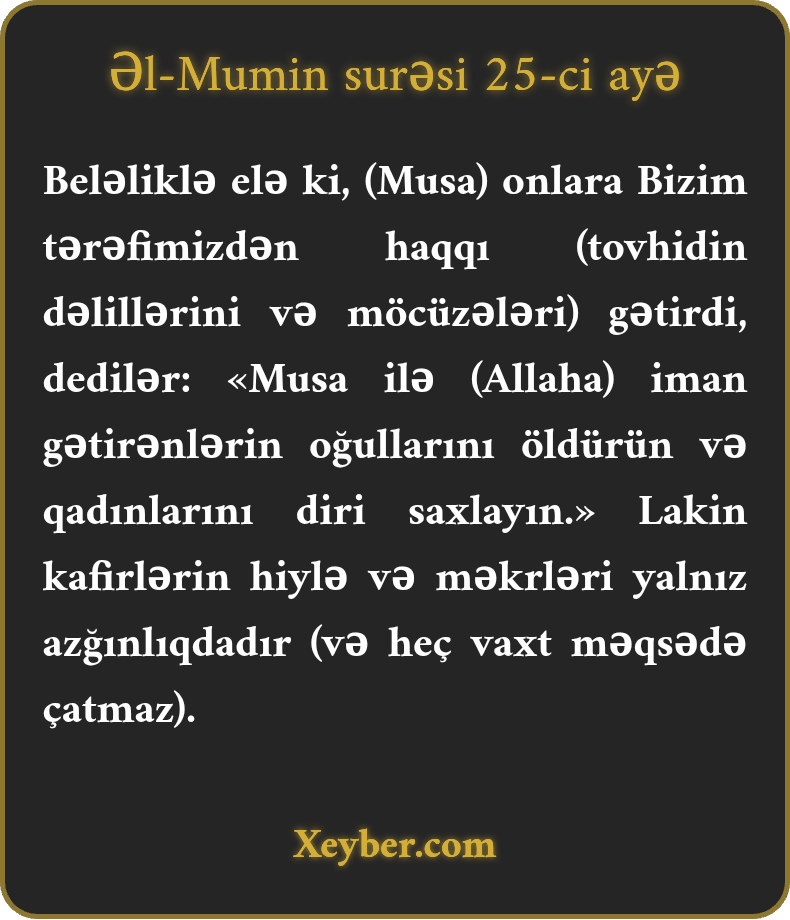 Beləliklə elə ki, (Musa) onlara Bizim tərəfimizdən haqqı (tovhidin dəlillərini və möcüzələri) gətirdi, dedilər: «Musa ilə (Allaha) iman gətirənlərin oğullarını öldürün və qadınlarını diri saxlayın.» Lakin kafirlərin hiylə və məkrləri yalnız azğınlıqdadır (və heç vaxt məqsədə çatmaz).