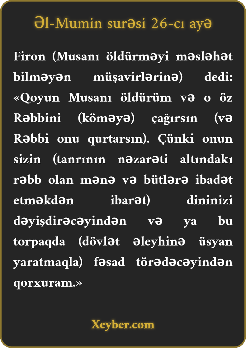Firon (Musanı öldürməyi məsləhət bilməyən müşavirlərinə) dedi: «Qoyun Musanı öldürüm və o öz Rəbbini (köməyə) çağırsın (və Rəbbi onu qurtarsın). Çünki onun sizin (tanrının nəzarəti altındakı rəbb olan mənə və bütlərə ibadət etməkdən ibarət) dininizi dəyişdirəcəyindən və ya bu torpaqda (dövlət əleyhinə üsyan yaratmaqla) fəsad törədəcəyindən qorxuram.»