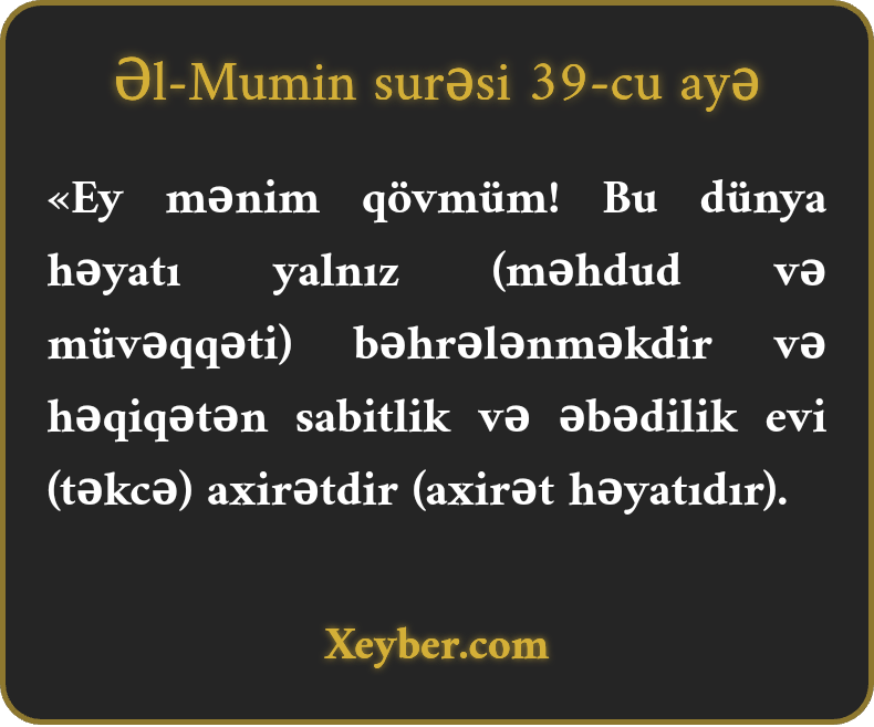 «Ey mənim qövmüm! Bu dünya həyatı yalnız (məhdud və müvəqqəti) bəhrələnməkdir və həqiqətən sabitlik və əbədilik evi (təkcə) axirətdir (axirət həyatıdır).