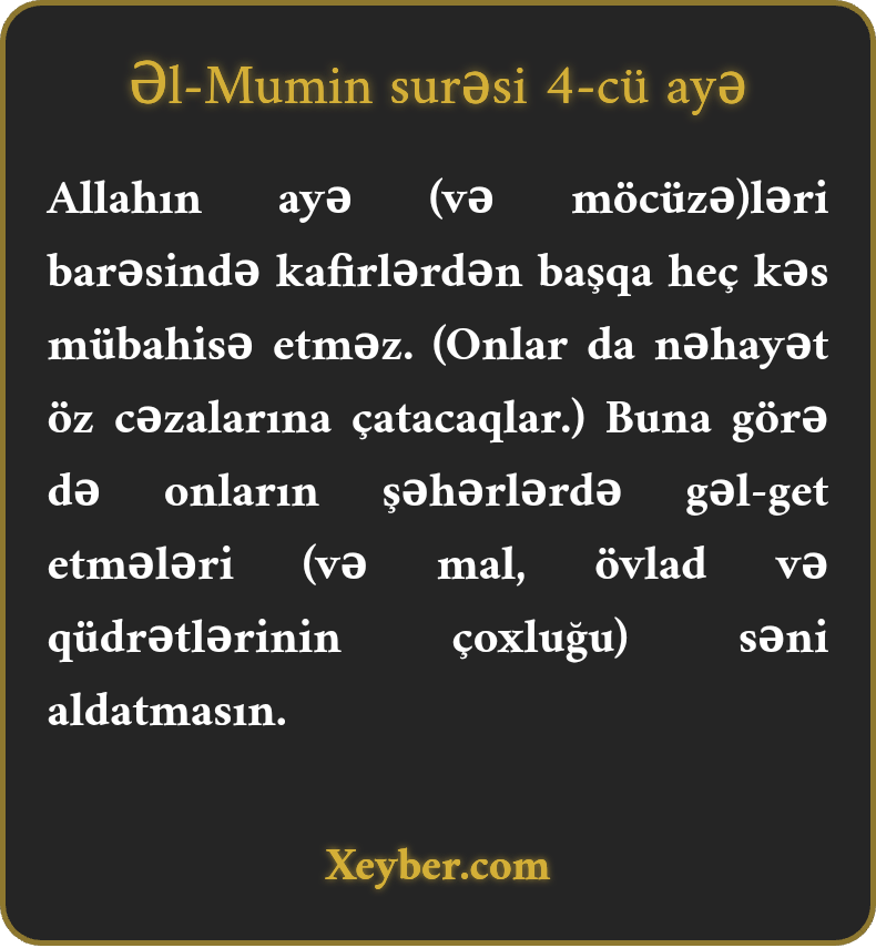 Allahın ayə (və möcüzə)ləri barəsində kafirlərdən başqa heç kəs mübahisə etməz. (Onlar da nəhayət öz cəzalarına çatacaqlar.) Buna görə də onların şəhərlərdə gəl-get etmələri (və mal, övlad və qüdrətlərinin çoxluğu) səni aldatmasın.
