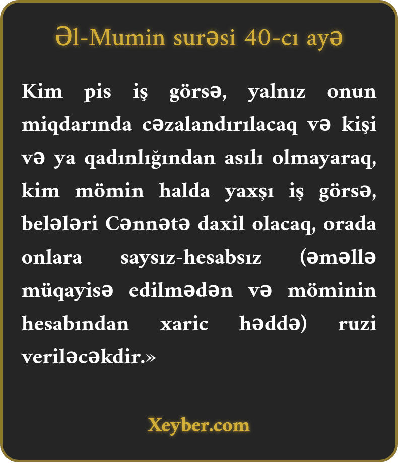 Kim pis iş görsə, yalnız onun miqdarında cəzalandırılacaq və kişi və ya qadınlığından asılı olmayaraq, kim mömin halda yaxşı iş görsə, belələri Cənnətə daxil olacaq, orada onlara saysız-hesabsız (əməllə müqayisə edilmədən və möminin hesabından xaric həddə) ruzi veriləcəkdir.»