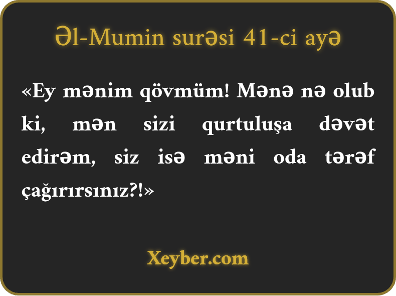 «Ey mənim qövmüm! Mənə nə olub ki, mən sizi qurtuluşa dəvət edirəm, siz isə məni oda tərəf çağırırsınız?!»