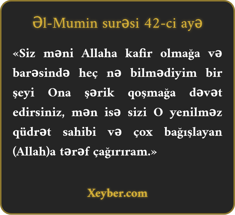 «Siz məni Allaha kafir olmağa və barəsində heç nə bilmədiyim bir şeyi Ona şərik qoşmağa dəvət edirsiniz, mən isə sizi O yenilməz qüdrət sahibi və çox bağışlayan (Allah)a tərəf çağırıram.»