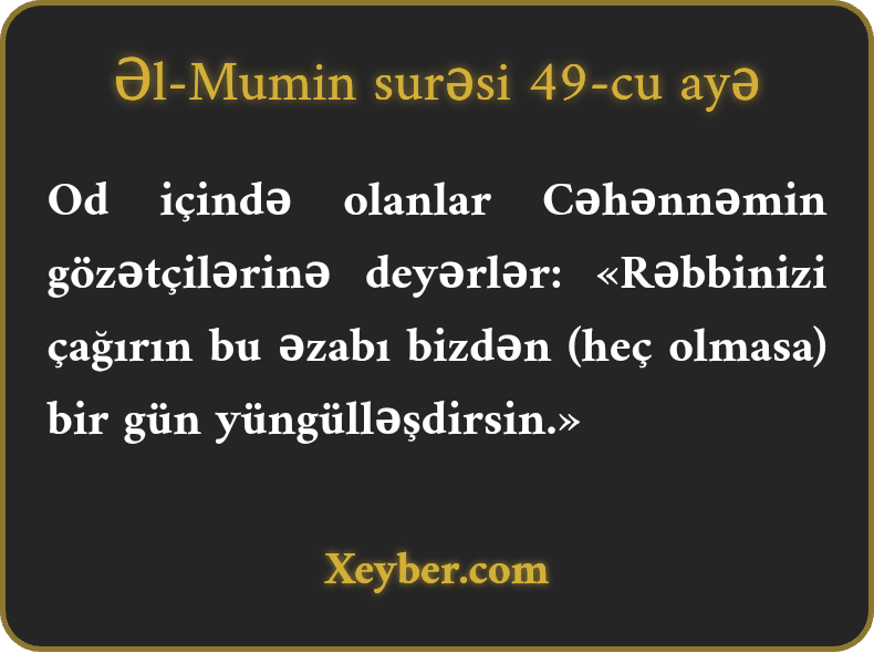 Od içində olanlar Cəhənnəmin gözətçilərinə deyərlər: «Rəbbinizi çağırın bu əzabı bizdən (heç olmasa) bir gün yüngülləşdirsin.»