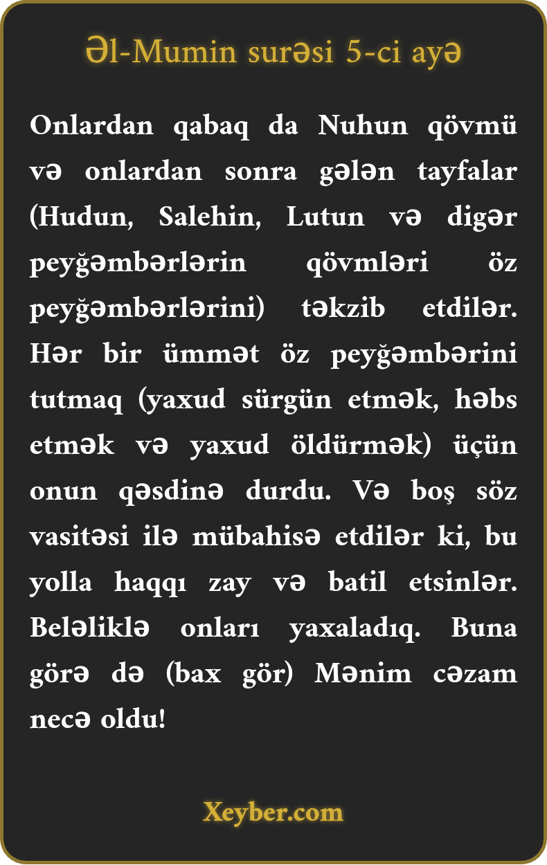 Onlardan qabaq da Nuhun qövmü və onlardan sonra gələn tayfalar (Hudun, Salehin, Lutun və digər peyğəmbərlərin qövmləri öz peyğəmbərlərini) təkzib etdilər. Hər bir ümmət öz peyğəmbərini tutmaq (yaxud sürgün etmək, həbs etmək və yaxud öldürmək) üçün onun qəsdinə durdu. Və boş söz vasitəsi ilə mübahisə etdilər ki, bu yolla haqqı zay və batil etsinlər. Beləliklə onları yaxaladıq. Buna görə də (bax gör) Mənim cəzam necə oldu!